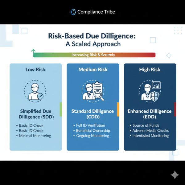KYC, CDD, and EDD operate effectively only when guided by the Risk-Based Approach (RBA) — the principle that compliance controls must be proportional to risk exposure.